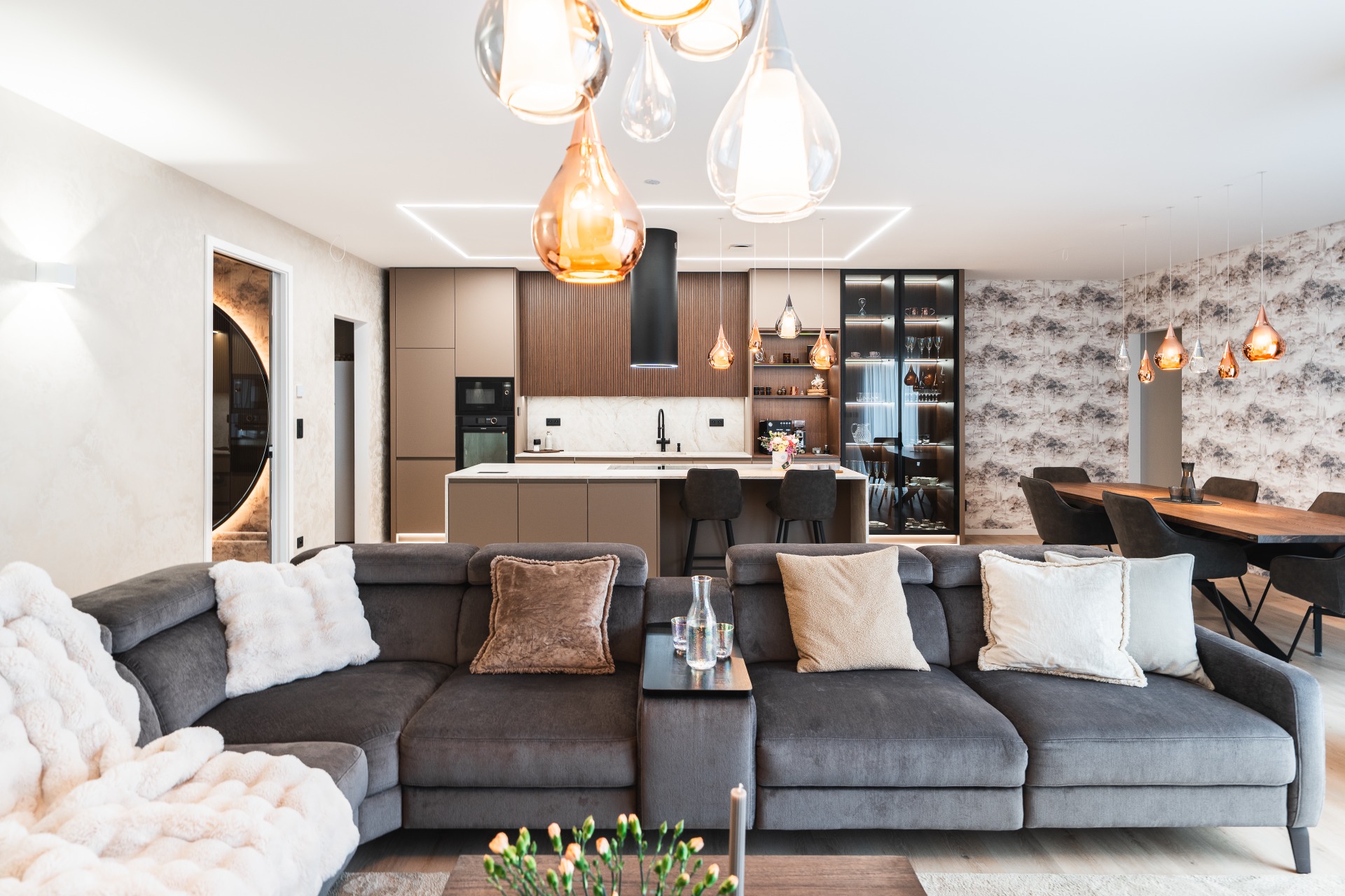 Skleněné detaily se promítají celým interiére. Zlaté odlesky světel přidávají tomuto interiéru luxusního dojmu. Celý interiér je navržený v zemitých teplých tónech a proto je v jídelní části je použita tapeta s motivy stromu, která dané místnosti doplní a propojí.