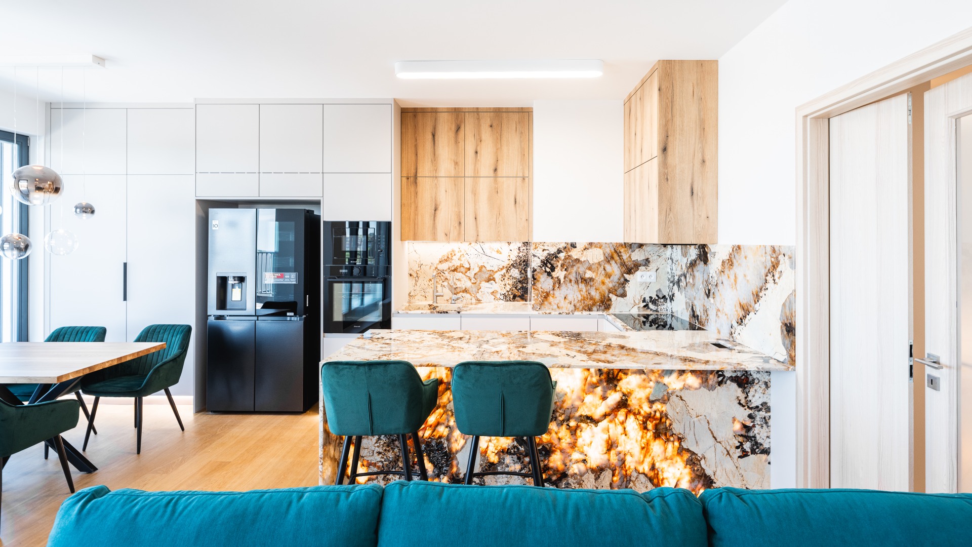 Tento byt jsme přebrali od klientů včetně hotových podlah a interiérových dveří. Vše ostatní, včetně návrhů a realizací, jsem dodala já. Hlavní dominantou je společný prostor obývacího pokoje a kuchyňské linky, který obsahuje jeden z nejkrásnějších přírodních kamenů, kvarcit Patagonie. tento kámen je dost výrazný, proto jsem volila zbytek interiéru minimalistický v neutrálních odstínech s doplněním pouze jednou barvou.